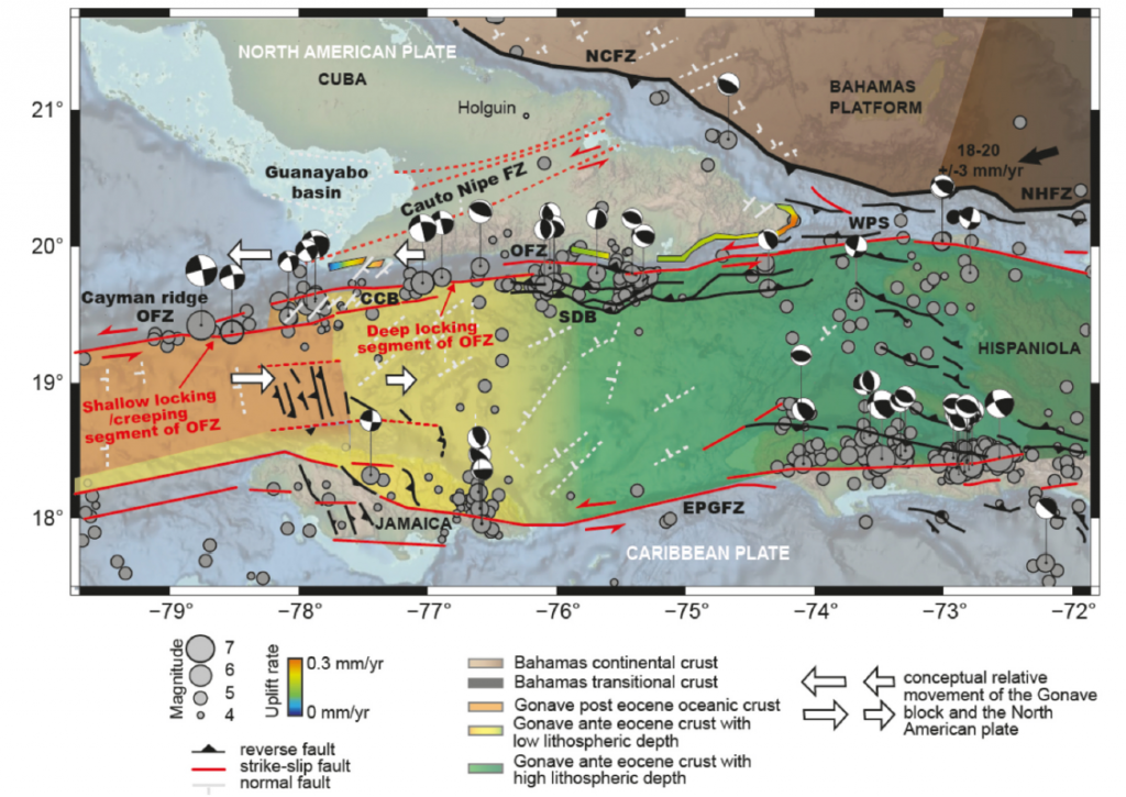 In the central part, the uplift is associated with NW-SE folding linked to a transpressional relay zone of the Oriente Fault Zone and to the offshore E-W Santiago Deformation Belt. In the east, at Punta Maísi, uplift results from a north-dipping thrust close to the coast linked with the oblique collision of the Bahamas platform against Cuba. The intensity of coastal uplift and locations of relay zones seems related to lateral variations in rheology and thickness of the tectonic plates. The uplift of the coast of SE Cuba is controlled by the oblique collision of the Bahamas platform of the North America continental plate against the continental crust of the Caribbean plate to the east and the oceanic/continental transition of the Caribbean plate to the West.