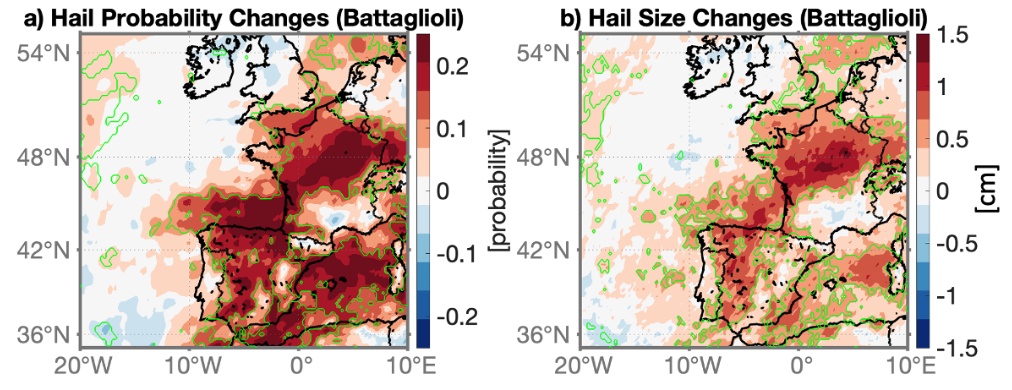 Figure: Changements liés au climat de la probabilité et de la taille de la grêle pour des conditions atmosphériques analogues à l’événement du 3 mai 2025. (a) Variation de la probabilité de grêle. (b) Variation de la taille des grêlons (en cm). Les anomalies sont calculées entre une période passée (1974–1999) et une période récente (1999–2024) à circulation atmosphérique comparable.