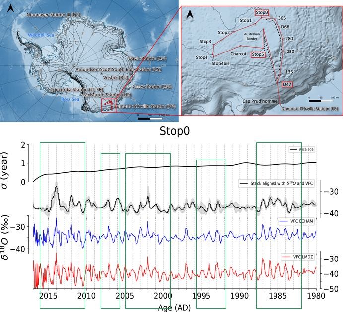 Les isotopes stables de l’eau sont largement utilisés comme traceurs de la variabilité passée des températures en Antarctique. Néanmoins, le lien isotopes–température n’est pas direct: les processus de surface (érosion, sublimation, redistribution par le vent), d’archivage (diffusion) ainsi que prédépositionnels (origine des masses d’air, altitude, humidité) peuvent réduire fortement la part du signal expliquée par la température, notamment dans les zones côtières. Dans cette thèse, les compositions isotopiques de 9 carottes de névé (20 à 40 m de profondeur, couvrant la période de 1979 à 2016) forées en 2016 sur 3 sites de la Terre Adélie côtière (Antarctique de l’Est) sont comparées à celles obtenues par modélisation de carottes de névé virtuelles (VFC, pour Virtual Firn Cores) avec des modèles de circulation générale atmosphérique prenant en compte les isotopes. Pour deux des sites, les résultats montrent une bonne concordance entre les VFC et les données, y compris en profondeur dans les carottes où la diffusion affecte l’enregistrement. Par contre, pour le troisième site qui est particulièrement venteux, les 3 carottes individuelles n’ont pas permis de reconstruire un signal cohérent, le vent induisant un trop fort bruit stratigraphique dans le signal isotopique. Cette thèse a également permis d’améliorer les modèles VFC dans les 3 premiers mètres des carottes de névé en ajoutant la description du mélange du signal isotopique dû à la circulation de la vapeur d’eau dans la porosité ouverte de la neige de surface.