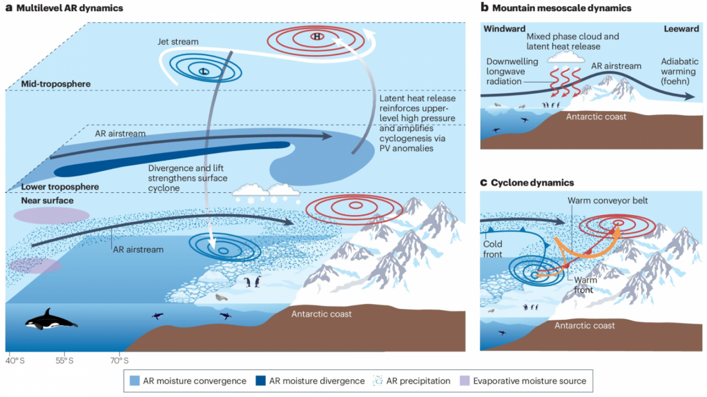 Cependant, elles peuvent également déclencher des épisodes étendus de fonte de surface, comme l’effondrement final de la plate-forme de glace Larsen A en 1995 et de Larsen B en 2002. Le changement climatique devrait entraîner un renforcement des RA, le réchauffement d’origine anthropique augmentant la quantité de vapeur d’eau dans l’atmosphère. Les recherches futures devront déterminer comment ces impacts du changement climatique modifieront les relations entre les RA antarctiques, le bilan de masse net de la calotte glaciaire et l’élévation future du niveau de la mer.