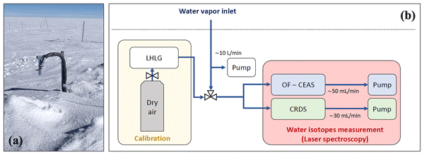 Dans les régions polaires, la composition isotopique de la vapeur d’eau atmosphérique est un paramètre clé pour comprendre le lien entre les compositions isotopiques des précipitations et de la neige et interpréter les archives climatiques isotopiques des carottes de glace. Dans cette étude, nous présentons un nouvel enregistrement précis sur 2,5 mois de la composition isotopique de la vapeur d’eau atmosphérique pendant l’été austral 2023-2024 (du 6 décembre 2023 au 14 février 2024) à la station Concordia (Antarctique oriental), à partir de deux spectromètres laser basés sur des techniques de mesure différentes, qui sont calibrés indépendamment et tous deux optimisés pour mesurer dans des environnements à faible humidité. Nous montrons que les deux instruments mesurent avec précision la variabilité diurne estivale du δ18O, du δD et du d-excess de la vapeur d’eau, lorsque le rapport de mélange de la vapeur d’eau est constamment supérieur à 200 ppmv. Nous comparons ces mesures aux résultats du modèle de circulation générale atmosphérique isotopique LMDZ6-iso et montrons que le modèle présente des biais tant dans la composition isotopique moyenne de la vapeur d’eau que dans l’amplitude du cycle diurne, ce qui correspond aux études précédentes. Cette étude fournit donc un nouvel ensemble de données sur la composition isotopique de la vapeur d’eau atmosphérique sur le plateau antarctique, qui peut être utilisé pour évaluer les modèles de circulation générale atmosphérique isotopiques.
